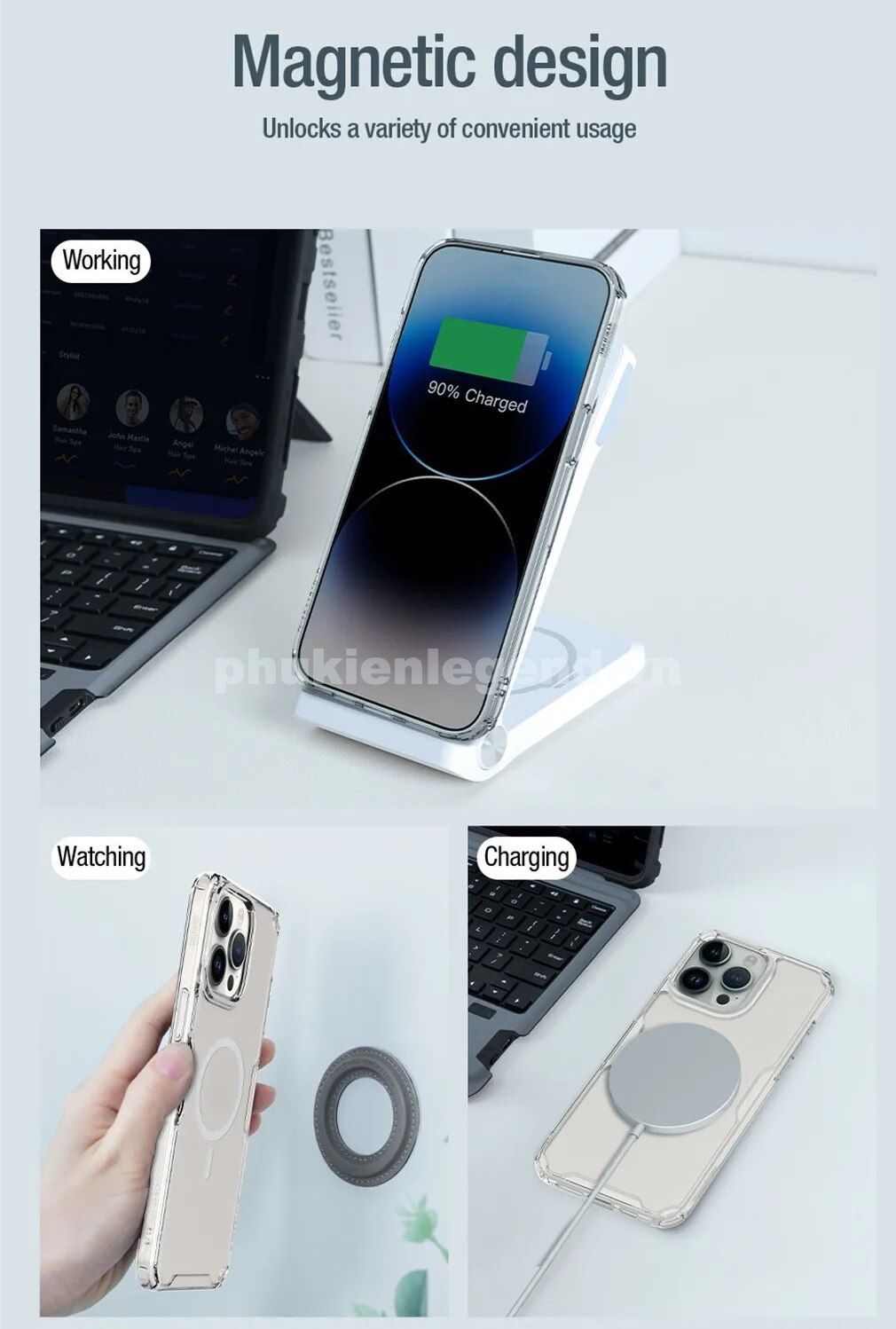 - thiết kế với phần mặt lưng trang bị lớp Nam châm giúp chiếc cho iPhone của bạn được gắn chính xác vào bộ sạc nhanh không dây