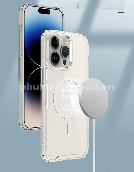Ốp lưng chống sốc trong suốt hỗ trợ sạc Maqsafe cho iPhone 15 Pro hiệu Nillkin Magnetic Wireless độ trong tuyệt đối, chống trầy xước, chống ố vàng, tản nhiệt tốt
