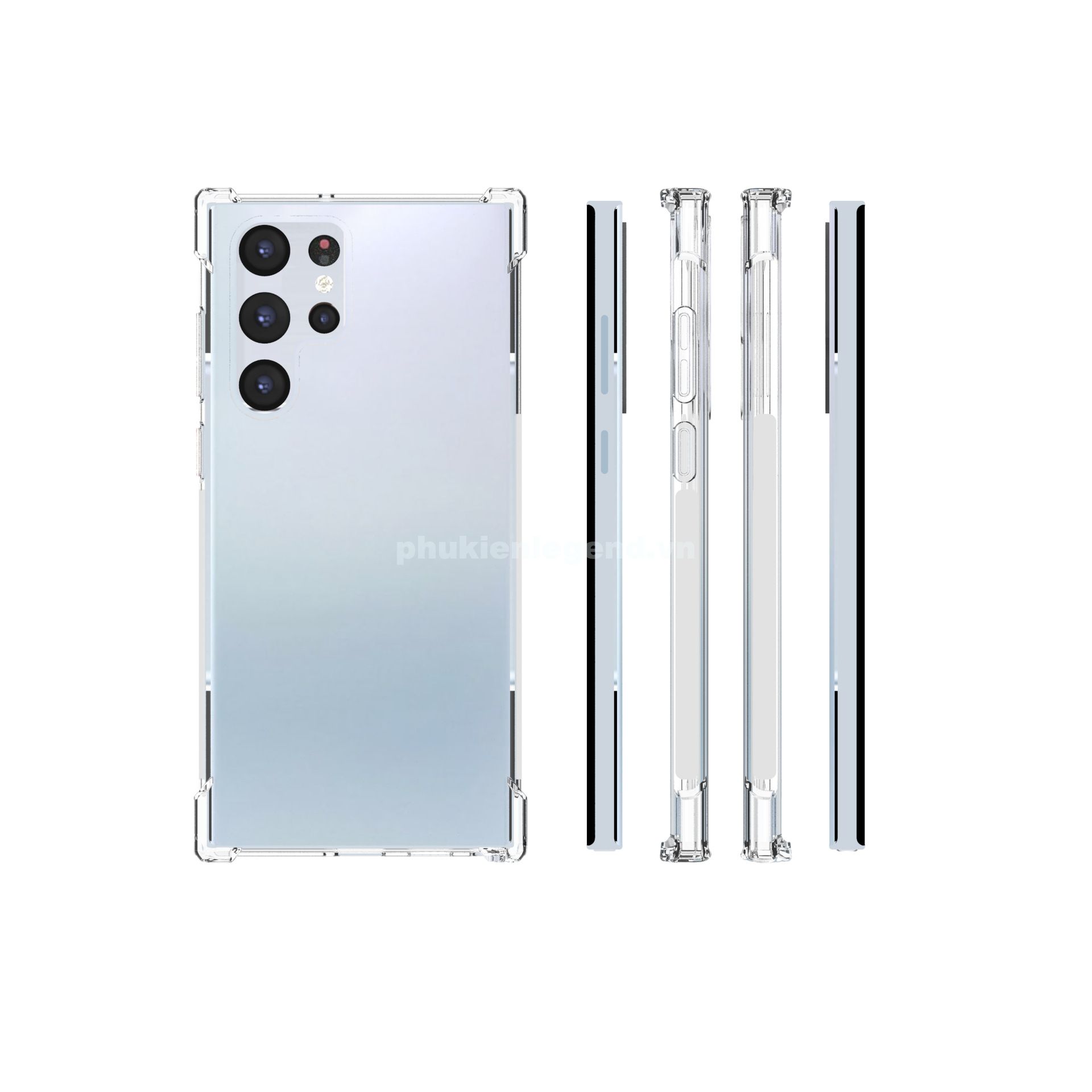 Ốp lưng dẻo trong chống sốc Samsung Galaxy S22 Ultra chất liệu TPU dày 0.9 mm, mềm dẻo, trong suốt, có độ đàn hồi cao, có thể bóp lại, cuộn lại mà không biến dạng. Ốp lưng được thiết kế với 4 góc dày dặn hơn (hầu hết khi rơi máy các góc sẽ va chạm đầu tiến), kết hợp với phần khung viền từ nhựa dẻo TPU cao cấp khá dầy dặn (~1mm), phần tiếp xúc với cạnh máy có làm thêm các đường gân không những giúp cho ốp cầm chắc tay hơn mà còn tăng khả năng đàn hồi, bảo vệ toàn bộ máy luôn an toàn trước mọi va chạm, mặt lưng còn 4 chấu nhỏ nhô cao để nâng phần lưng của máy lên khi để lên bàn hạn chế xước Camera sau của máy. Mọi chi tiết hoàn thiện của ốp lưng đều làm rất đẹp, các vết cắt mịn, đều. Các phím bấm được làm nổi giúp thao tác dễ dàng.
