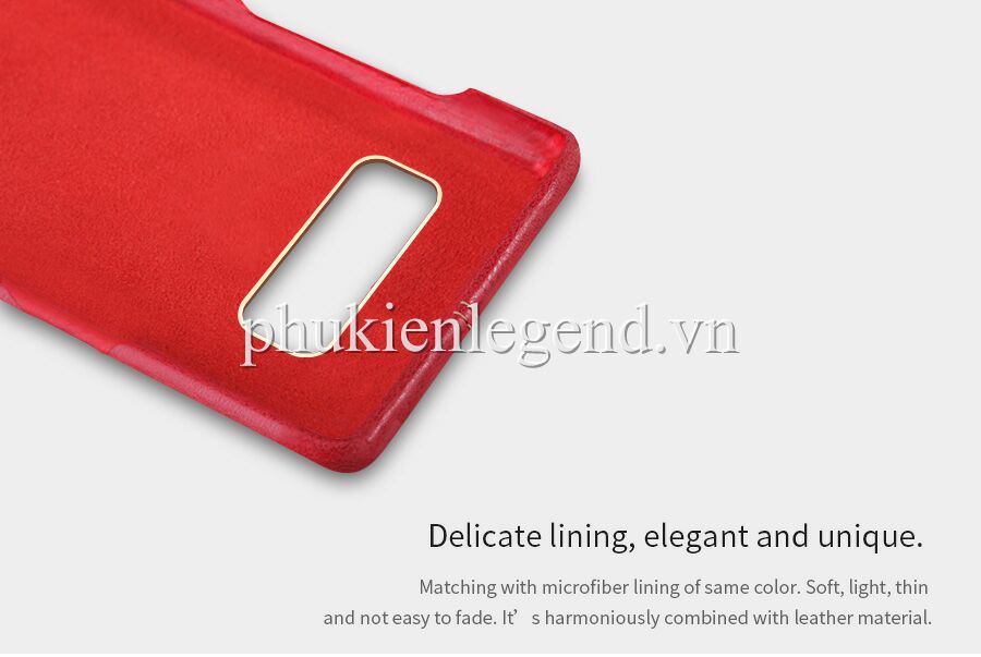 Ốp lưng Samsung Note 8 Nillkin Englon chính hãng. Sản phẩm sử dụng chất liệu da cao cấp của hãng Nillkin Englon nên bạn hoàn an tâm khi sử dụng. Các chi tiết được thiết kế tỉ mỉ, tinh xảo, tinh tế, kèm đường chỉ may thủ công nhìn khỏe khoắn, nam tính. Logo Nillkin, phần khoét hở táo và lỗ camera được làm sáng bóng bằng chất liệu inox. Đặc biệt : Phần giữa của ốp lưng có thiết kế tấm kim loại chìm để hút nam châm, phù hợp khi dùng kèm đế hút nam châm cho điện thoại trên ô tô, xe hơi. Phía trong ốp lưng, phần tiếp xúc với máy là lớp micro siêu mịn, bảo vệ máy chống va đập rất tốt. Sản phẩm có 4 màu thời thượng : đen, xanh đen, đỏ đô,nâu da bò.